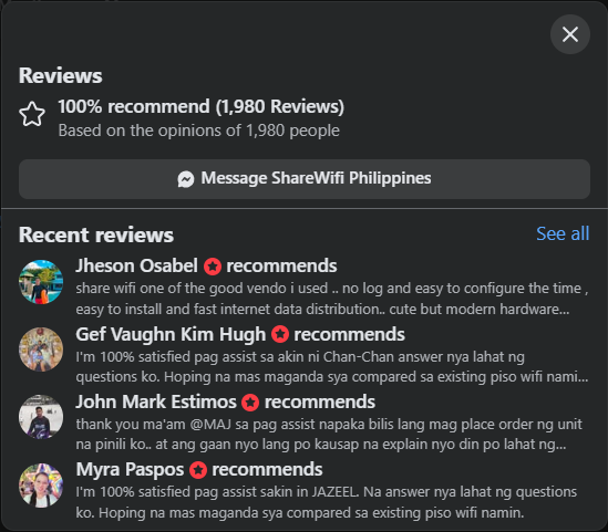 I-message ti opisyal a ShareWiFi Philippines Facebook page ken pilien ti “Talk to human support.”